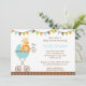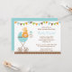 Adorável convite para chás de fraldas, com um leão e girafa sentados em um carrinho de ponto azul com um beliche festivo no topo.