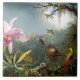 A orquídea botânica do vintage lindo floresce e os colibris em uma arte da pintura da floresta tropical estão neste azulejo.