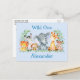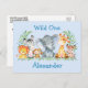 Watercolor Safari Jungle Animal Selvagens Selvagens Um Cartão Postal De Primeiro Convite de aniversário. Os bebês incluem elefante, macaco, girafa, rinoceronte, zebra e leão nas folhas de samambaia. Cores d'água, vegetação botânica. Texto Azul.