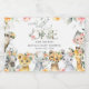 Adicione um toque pessoal à celebração do seu chá de fraldas com estes itens de na moda e festa memoráveis! Design apresenta animais da selva (girafa, macaco, zebra, leão, elefante, chita, merkat, rinoceronte), flores de hibisco e folhas de eucalipto em fundo branco.