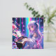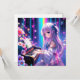 Menina de anime bonito tocando piano cercada por estrelas e flores em roxo, azul e rosa.