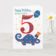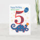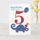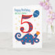Um cartão divertido de 5 para personalizar, com um dinossauro fofo, vestindo um chapéu de festa e com um balão amarrado à cauda. O dinossauro (diplodocus) tem bolinhas cor-de-rosa, amarelas e laranja e o número 5 é preenchido com listras de cor clara. A saudação do cobrir principal, em azul para combinar com o dinossauro, é, "Parabéns" com espaço para você adicionar o nome do aniversário da criança. O balão também é azul e tem a palavra "HOJE!" escrita em branco e há pequenas estrelas amarelas sobre o fundo branco. A mensagem dentro é apenas uma sugestão e você pode personalizá-la facilmente se quiser.