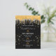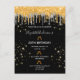 Um convite moderno, na moda e glamouroso para a 50ª festa de aniversário (ou qualquer idade) da mulher. Um fundo preto chic com um elegante ouro falso e um brilho prateado, pintura pingando. Decorado com óculos, flautas e bolhas. Personalize e adicione um nome e detalhes da parte. O nome é escrito com um script de estilo manuscrito de tendência. Letras coloridas de cinza clara.
