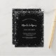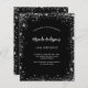 Um fundo na moda preto. Decorado com falso brilho prateado, faíscas. Personalize e adicione um nome, idade e detalhes da festa. O nome é escrito com um script de estilo manuscrito. 1 folha = 1 convite impresso de borda a borda.