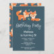 Convite de aniversário com uma ilustração gráfica de 2 raposas de laranja bonitinhas e felizes.