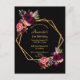 Na frente: Um convite para uma aniversário de 21 anos elegante. Um fundo preto chic com uma falsa estrutura geométrica dourada. Decorados com flores, rosas e penas de tipo vassoura, escuras e cor-de-rosa, de cor-d'água. Modelos para um nome e detalhes da festa. O nome é escrito com um script de estilo manuscrito, letras ouros coloridas. Fundo: fundo preto colorido.