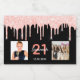 Para uma festa de aniversário de 21 anos divertida e glamourosa. Cor de fundo preto clássico, decorada com pingos de brilho rosa, aparência de pingar de tinta. Personalize e adicione um nome, 21 anos e uma data. Data de nascimento ou data da festa. Letras brancas e rosa douradas. Adicione 2 - duas das suas próprias fotos de seus amigos, família, crianças, destino de viagem de sonho, crianças, namorado/marido.