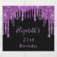 Para um aniversário de 21 anos moderno, moderno e glamouroso. Um clássico fundo preto elegante, decorado com púrpura escura, púrpura e púrpura, pingos, pintura pingando. Personalize e adicione um nome e idade 21. Colar texto cor-de-rosa.