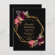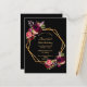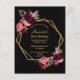 Na frente: Um convite para uma aniversário de 30 anos elegante. Um fundo preto chic com uma falsa estrutura geométrica dourada. Decorados com flores, rosas e penas de tipo vassoura, escuras e cor-de-rosa, de cor-d'água. Modelos para um nome e detalhes da festa. O nome é escrito com um script de estilo manuscrito, letras ouros coloridas. Fundo: fundo preto colorido.