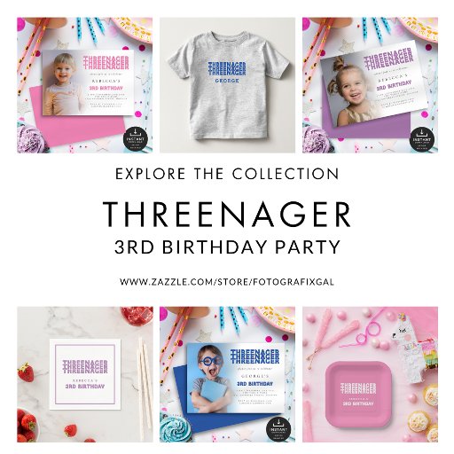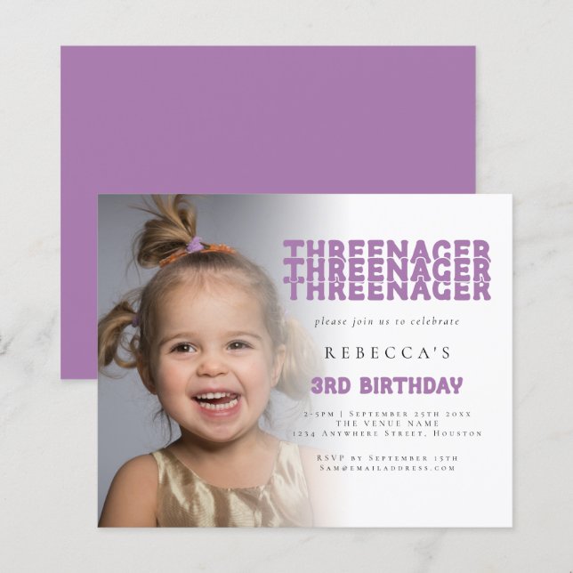 Lilac, aniversário de 3 anos do Partido da Sobreposição de Fotos do Threenager do Orçamento. Um alternativo com preço inferior a 4,5 x 5,6" em um semirbrilho de 110 lb, semelhante em espessura a um cartão postal. O Threenager está em um estilo retrô e um script set para aniversário de 3 anos em lilac que pode ser alterado para outra cor se você quiser, assim como a cor de coordenação no outro lado. O resto do texto que você pode facilmente personalizar. Substitua a imagem de exemplo pelo seu favorito.