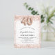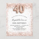 Para um aniversário de 40 anos elegante. Um fundo branco. Decorado com rosa dourado, cintilação falsa rosa, faíscas. Personalize e adicione um nome e detalhes da festa. O nome é escrito com um script de estilo manuscrito, número 40 com fontes de estilo de balão. 1 folha = 1 convite impresso de borda a borda.