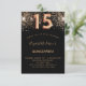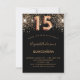 Um convite moderno, na moda e glamouroso para a Quinceañera, festa de aniversário 15. Um fundo preto decorado com falso brilho. O nome é escrito com um moderno ouro escrito com letras no estilo à mão. Personalize e adicione os detalhes da sua festa. O número 15 é escrito com uma fonte de estilo balão, script.