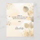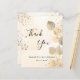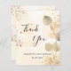 Um cartões de agradecimentos para um aniversário de 50 anos (ou qualquer idade). Um fundo de cor aquosa de ouro decorado com ouro eucalipto e pó dourado falso. Na frente, um grande script de cor preta, escrito à mão, e o texto: Obrigado, seu texto, título e uma data. Voltar: Personalize e adicione seu nome e nota de agradecimento.