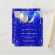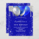 Um fundo azul real. Decorado com falso brilho prateado pingando o aspecto de pingar tinta, faíscas e balões. Personalize e adicione um nome e detalhes da parte. O nome é escrito com um script de estilo manuscrito.
