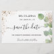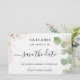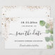 Uma tendência Salve a data para uma festa de aniversário 40th (ou qualquer idade). Um fundo branco na moda, decorado com folhagem de eucalipto e pó de ouro falso. Personalize e adicione uma data, nome e texto. . O texto: Salvar a Data é gravado com um script de estilo com letra de tendência grande com alternâncias.