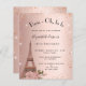 Um convite moderno, na moda e glamouroso para uma festa de aniversário 18 (ou qualquer idade), tema parisiense. Um fundo metálico rosa dourado falso com brilhos falsos e a torre Eiffel com algumas flores. O nome é escrito com um moderno estilo escrito à mão. Personalize e adicione os detalhes da sua festa.