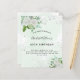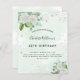 Um convite moderno, na moda e glamouroso para a 40ª festa de aniversário (ou qualquer idade) da mulher. Um fundo verde de cor aquosa, com poeira cinzenta prateada suja e florais brancos e verde. O nome é escrito com um moderno script estilo escrito à mão preta. Personalize e adicione um nome, idade e detalhes da sua festa