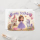 Uma pequena princesa celebra seu dia especial com um unicórnio, um bolo rosa, e balões alegres em um sonhador campo de conto de fadas, onde a magia brilha em cada esquina e a felicidade enche o ar como poeira estelar
