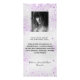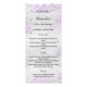 Cartão de menu de festa de aniversário. Personalize e adicione um nome, idade, data e menu. Fundo de aspecto fino prateado, decorado com pó brilhante roxo e lavanda. Letras pretas coloridas. Voltar: adicione uma foto, fatos divertidos, nomes (ou apague)