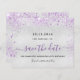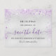 Um cartão de Save the Date feminino e moderno para uma festa de aniversário de 40 anos (ou qualquer idade). Um fundo metálico prateado falso moderno decorado com poeira brilhante roxa falsa. Personalize e adicione uma data e nome/idade 40. Letras coloridas pretas e roxas. O texto: Salve a Data é escrito com um estilo de letra manuscrita grande e moderno.