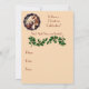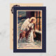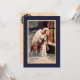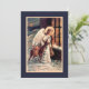 Este convite para natais vintages mostra um anjo do céu com um veado com presentes de Natal olhando pela janela na véspera de Natal para trazer paz e boa vontade.