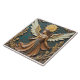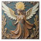 Um anjo fêmea de cabelo castanho, 25 anos, vestindo um bronze, vestido verde e asas, sol atrás dela, fundo de ornamentado com elementos florais, estilo alivio.
