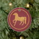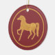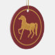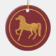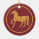 Um ornamento à moda com um cavalo ouro-colorido em um fundo vermelho escuro. O motivo do cavalo foi pintado à mão por Judy Adamson.