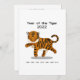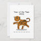 Este Ano do design Tigre é um tigre correndo que tem a palavra chinesa que significa "tigre" escrita em suas listras e nos anos anteriores deste cartaz zodíaco escrito embaixo para referência. Personalize a parte de trás deste cartão com o seu cabeçalho ou mensagem personalizado para utilizar para saudações sazonais ou convites para comemorações de ano novo.