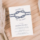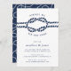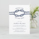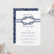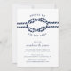 Nossos convites para janto de ensaio de casamentos quicos costeiros apresentam estilo náutico clássico em azul marinho e branco. "Antes de amarrar o nó" aparece no topo, curvado em torno de uma ilustração de corda azul-marinho. Personalize com seus detalhes de janto de ensaio abaixo em uma combinação chic de serif e sans serif lettering. Perfeito para jantadas náuticas, técnicas de praia ou de ensaio de verão. Cartões que se revertem a um padrão de corda náutica de looping, de cor branca, em marinho.
