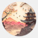 Um conjunto de belos adesivos redondos castanhos com uma cena de recorte de papel que representa o antigo edifício chinês, árvores, montanhas e lago.