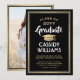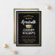 Compartilhe a alegria de um segundo grau ou formandos com estes anúncios personalizados em preto, ouro e branco. (DICA DE IMAGEM: Uma maneira fácil de centralizar uma imagem exatamente como você deseja é recortá-la antes de carregá-la no site do Zazzle.) Este modelo inclui o nome do formando, o ano de aula e a escola, assim como qualquer texto de sua escolha, como detalhes do convite de festas, honras especiais, título do grau, citação de inspiração favorita, informações de contato do formando, planos educacionais futuros ou nova posição de emprego. Todo texto é simples de personalizar. Design apresenta uma moderna borda de folha de ouro falsa e boné de conselho de argamassa, caligrafia elegante de script, tipografia tradicional e uma foto de sua escolha, como uma foto de mais velho ou imagem da cerimônia de início. Observe que o ouro é impresso a cor, não a folha metálica. Estes cartões de anúncio de graduação são uma maneira moderna e chique de compartilhar sua celebração especial com a família e os amigos. Parabéns ao formando!