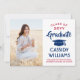 Compartilhe a alegria de uma formatura do ensino médio ou faculdade com esses anúncios de fotos personalizados vermelhos, brancos e azuis. (DICA DE POSICIONAMENTO DE IMAGEM: Uma maneira fácil de centralizar uma imagem exatamente como você deseja é cortá-la antes de fazer o upload para o site da Zazzle.) Este modelo é simples de personalizar com qualquer texto de sua escolha, como detalhes do convite da festa, nomes dos pais, honrarias especiais, título do diploma, citação inspiradora favorita, informações de contato do graduado, planos de educação futura ou nova posição no emprego. Se houver algum texto que não seja desejado, basta excluí-lo. O design apresenta um fundo branco, boné azul, caligrafia de estilo manuscrito, tipografia moderna e elegante, e uma foto de sua escolha, como uma foto de formatura ou imagem da cerimônia de formatura. Esses cartões de anúncio de formatura elegantes são uma maneira elegante de compartilhar a celebração do seu dia especial com