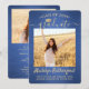 Compartilhe a alegria de um segundo grau ou formandos com estes anúncios personalizados de 2 fotos azuis e dourados. (DICA DE IMAGEM: Uma maneira fácil de centralizar uma imagem exatamente como você deseja é recortá-la antes de carregá-la no site do Zazzle.) Este modelo inclui o nome do formando, o ano de aula e a escola, e é simples de personalizar com qualquer texto de sua escolha, como detalhes do convite de festas, nomes de pais, honras especiais, título do grau, citação de inspiração favorita, informações de contato do formando, planos educacionais futuros ou nova posição de emprego. Se houver algum texto não desejado, simplesmente exclua-o. Design apresenta um fundo azul-real escovado, boné de conselho de morteiro de folha falsa, caligrafia de script escrita à mão, tipografia moderna minimalista e duas fotos de sua escolha, como fotos de mais velho ou imagens da cerimônia inicial. Observe que o ouro é impresso a cor, não a folha metálica. Estes cartões de anúncio elegantes de formatura são uma forma na moda para compartilhar sua celebração especial com a família e os amigos. Parabéns ao formando!