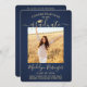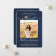 Compartilhe a alegria de um segundo grau ou formandos com estes anúncios de azul e ouro personalizados de marinho de 2 fotos. (DICA DE IMAGEM: Uma maneira fácil de centralizar uma imagem exatamente como você deseja é recortá-la antes de carregá-la no site do Zazzle.) Este modelo é simples de personalizar com qualquer texto de sua escolha, como detalhes do convite de festas, nomes de pais, honras especiais, título de grau, citação inspiracional favorita, informações de contato do formando, planos educacionais futuros ou nova posição de emprego. Se houver algum texto não desejado, simplesmente exclua-o. Design apresenta um fundo ombre azul, boné de conselho de morteiro de folha de ouro falso, caligrafia com script, tipografia moderna minimalista e duas fotos de sua escolha, como fotos de mais velho ou imagens da cerimônia de início. Observe que o ouro é impresso a cor, não a folha metálica. Estas elegantes cartas de graduação são uma maneira moderna e chique de compartilhar sua celebração especial com a família e os amigos. Parabéns ao formando!