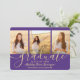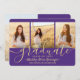 Compartilhe a alegria de um segundo grau ou formandos com estes anúncios personalizados de 4 fotos, roxas e ouro. Todas as imagens e textos são simples de personalizar. (DICA DE IMAGEM: Uma maneira fácil de centralizar uma foto exatamente como você deseja é recortá-la antes de carregá-la no site do Zazzle.) Este modelo pode ser personalizado com quaisquer detalhes de sua escolha, como informações sobre convites de festas, nomes de pais, honras especiais, título de grau, citação inspiracional favorita, informações de contato do formando, planos educacionais futuros ou nova posição de emprego. Design apresenta um fundo roxo, boné de conselho de morteiro de folha falsa, caligrafia de script manuscrita, tipografia moderna minimalista e quatro fotos de sua escolha, como fotos de mais velho ou imagens da cerimônia de início. Observe que o ouro é impresso a cor, não a folha metálica. Estas elegantes cartas de graduação são uma maneira moderna e chique de compartilhar sua celebração especial com a família e os amigos. Parabéns ao formando!