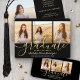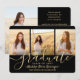 Compartilhe a alegria de um segundo grau ou formandos com estes anúncios personalizados de 4 colagens de fotos em preto e ouro. Todas as imagens e textos são simples de personalizar. (DICA DE IMAGEM: Uma maneira fácil de centralizar uma foto exatamente como você deseja é recortá-la antes de carregá-la no site do Zazzle.) Este modelo pode ser personalizado com quaisquer detalhes de sua escolha, como informações sobre convites de festas, nomes de pais, honras especiais, título de grau, citação inspiracional favorita, informações de contato do formando, planos educacionais futuros ou nova posição de emprego. Design apresenta um fundo preto, boné falso de morteiro de folha de alumínio, caligrafia de script de estilo manuscrito, tipografia moderna minimalista e quatro fotos de sua escolha, como fotos de mais velho ou imagens da cerimônia de início. Observe que o ouro é impresso a cor, não a folha metálica. Estas elegantes cartas de graduação são uma maneira moderna e chique de compartilhar sua celebração especial com a família e os amigos. Parabéns ao formando!