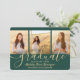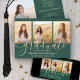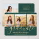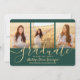 Compartilhe a alegria de um segundo grau ou formandos com estes anúncios de cores verdes e dourados de colagem de 4 fotos personalizados. Todas as imagens e textos são simples de personalizar. (DICA DE IMAGEM: Uma maneira fácil de centralizar uma foto exatamente como você deseja é recortá-la antes de carregá-la no site do Zazzle.) Este modelo pode ser personalizado com quaisquer detalhes de sua escolha, como informações sobre convites de festas, nomes de pais, honras especiais, título de grau, citação inspiracional favorita, informações de contato do formando, planos educacionais futuros ou nova posição de emprego. Design apresenta um fundo verde, boné de conselho de morteiro de folha falsa, caligrafia de script de estilo manuscrito, tipografia moderna minimalista e quatro fotos de sua escolha, como fotos de mais velho ou imagens da cerimônia de início. Observe que o ouro é impresso a cor, não a folha metálica. Estas elegantes cartas de graduação são uma maneira moderna e chique de compartilhar sua celebração especial com a família e os amigos. Parabéns ao formando!