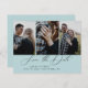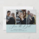 Caligrafia "Salve a data", 3 fotos de casamento salvam o cartão. Recursos, fundo de cor azul em pó e linha de texto modelo no verso para o site de casamento ou outras informações.