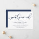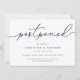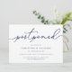 Precisa adiar o seu casamento ou mudar a data? Informe os convidados com estes cartões de anúncio de adiamento de casamento simples e elegantes. O design chic em azul marinho e branco apresenta "adiado" no topo em letra de caligrafia manuscrita, com seus nomes e nova data abaixo. Ajuste a redação e o nível de detalhe conforme necessário. Conforme mostrado, o texto de exemplo direciona os convidados ao seu site de casamento para informações adicionais.