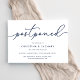 Precisa adiar seu casamento ou mudar a data? Informe os convidados com esses cartões de anúncio de adiamento de casamento simples e elegantes. O design chic em azul naval e branco apresenta "adiado" no topo em letra de caligrafia manuscrita, com seus nomes e nova data abaixo. Ajuste as palavras e o nível de detalhe conforme necessário. Conforme mostrado, o texto de exemplo direciona os convidados ao site do seu casamento para informações adicionais.