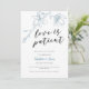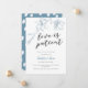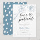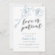 Cartão de anúncio de adiamento de casamento elegante e moderno com uma ilustração desenhada à mão de flores de magnólia em cor azul poeirenta com um texto em letra cursiva abaixo que diz "o amor é paciente."