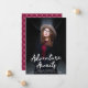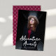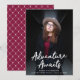 Anúncios de graduação de tendências que apresentam a foto vertical do formando com "Aguardas de Aventura" em letra branca de script manuscrito. Personalize a frente dos anúncios de graduação da Adventure Aguarda o nome do formando, o nome da escola e o ano de graduação. O anúncio se reverte para exibir um elegante padrão de burgundy e trellis branca.