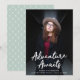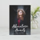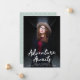 Anúncios de graduação de tendências que apresentam a foto vertical do formando com "Aguardas de Aventura" em letra branca de script manuscrito. Personalize a frente dos anúncios de graduação da Adventure Aguarda o nome do formando, o nome da escola e o ano de graduação. O anúncio se inverte para exibir um elegante padrão de marisca verde e branca.