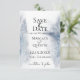 Lavagem em aquarela em tons de azul de inverno com detalhes de flocos de neve, cartão de salvar a data de casamento.