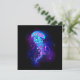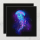 Água-viva grande, azul, desenhada artisticamente, brilhante, brilhante, com longos tentáculos sobre fundo preto com bioluminescência roxa. Água-viva luminosa.