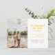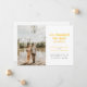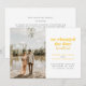 Se você mudou a data do casamento, mas decidiu que não podia esperar para se casar e fugiu para se casar em vez disso, compartilhe a grande notícia com os entes queridos com este anúncio de fuga. Ele apresenta texto em amarelo dourado e cinza escuro com espaço para uma única foto, bem como os detalhes sobre sua fuga. O verso do cartão tem espaço para uma mensagem pessoal.