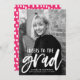 Na moda, modernos anúncios de graduação apresentando a foto vertical do formando com "Cheers to the formando" em um roteiro branco, com letra de pincel. Personalize a frente do anúncio adicionando o nome do formando, o nome da escola e o ano de graduação. O anúncio de graduação de fotos é revertido para exibir um padrão de abstrato branco e rosa quente.