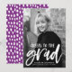 Na moda, modernos anúncios de graduação apresentando a foto vertical do formando com "Cheers to the formando" em um roteiro branco, com letra de pincel. Personalize a frente do anúncio adicionando o nome do formando, o nome da escola e o ano de graduação. O anúncio de graduação de fotos é revertido para exibir um padrão de abstrato roxo e branco.
