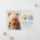 Um grupo de amigos animais da selva, incluindo um leão, girafa, pássaro, macaco, elefante e hipopótamo, se reúnem para dar as boas-vindas ao bebê menino neste cartão de anúncio de nascimento moderno e doce com tema de safári e foto em retrato. Acentos com padrões de bolinhas e listras. Azul com cores verde, laranja, azul, bege, marrom e cinza.