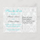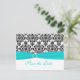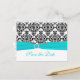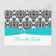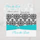 Este cartão de "Save the Date" em damasco preto e branco tem uma fita impressa aqua azul e um broche de joia diamante impresso que seria perfeito para um casamento com tema aqua e preto. ****Se você mudar as fontes ou o tamanho da fonte, parte do design e/ou texto pode ser cortado. Tudo será impresso como você vê no seu monitor. Não verei as alterações que você fizer e o Zazzle NÃO irá corrigir nada (erros de digitação, desalinhamento, etc.). O texto é totalmente personalizável. Se precisar de ajuda com este produto, por favor me envie um e-mail ANTES de fazer o seu pedido. Se você precisar de outros itens correspondentes, por favor envie seu pedido para niteowlstudio@gmail.com
